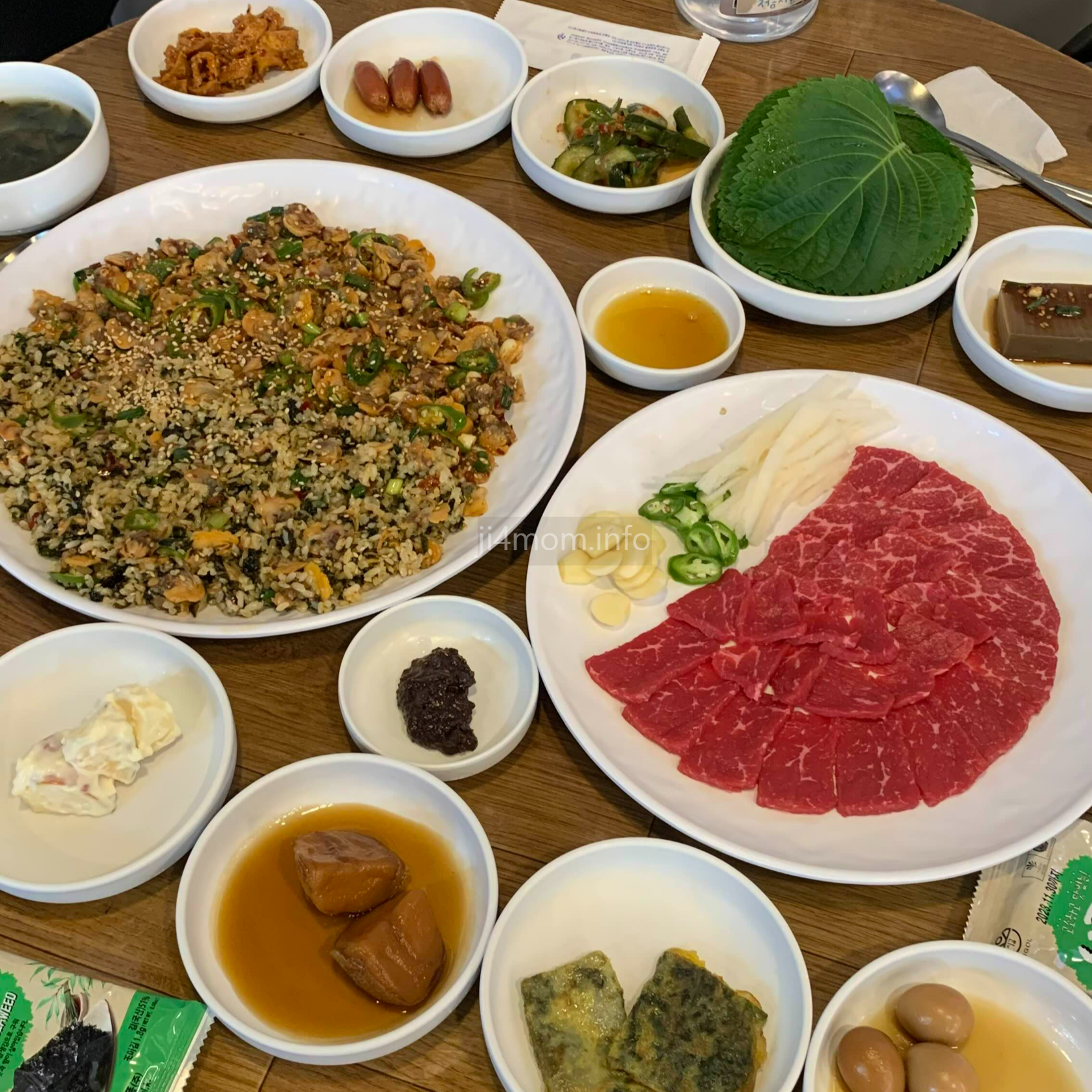 꼬막 무침은 깻잎과 밑반찬으로 나온 오이 무침과 다시마에 싸서 먹으면 그 맛이 예술이죠.